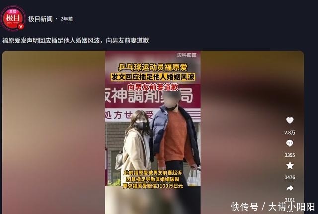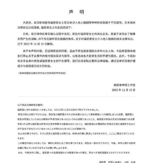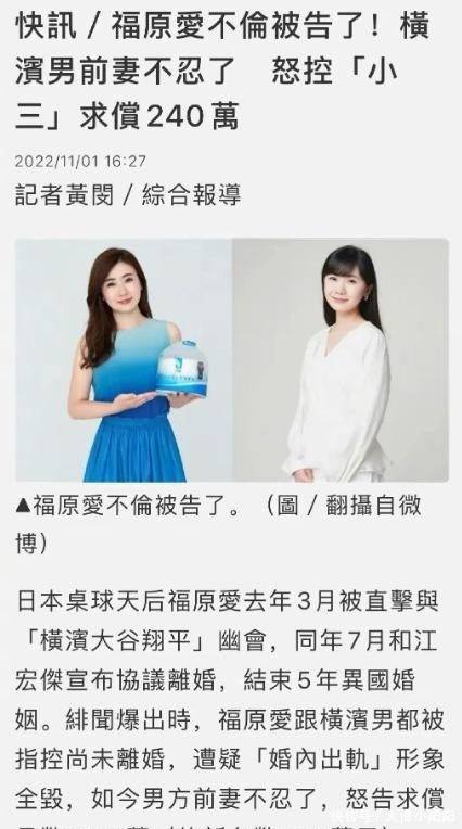 2022年11月,日本媒体爆料,福原爱被男友的前妻起诉,要求赔偿1100万日元。
